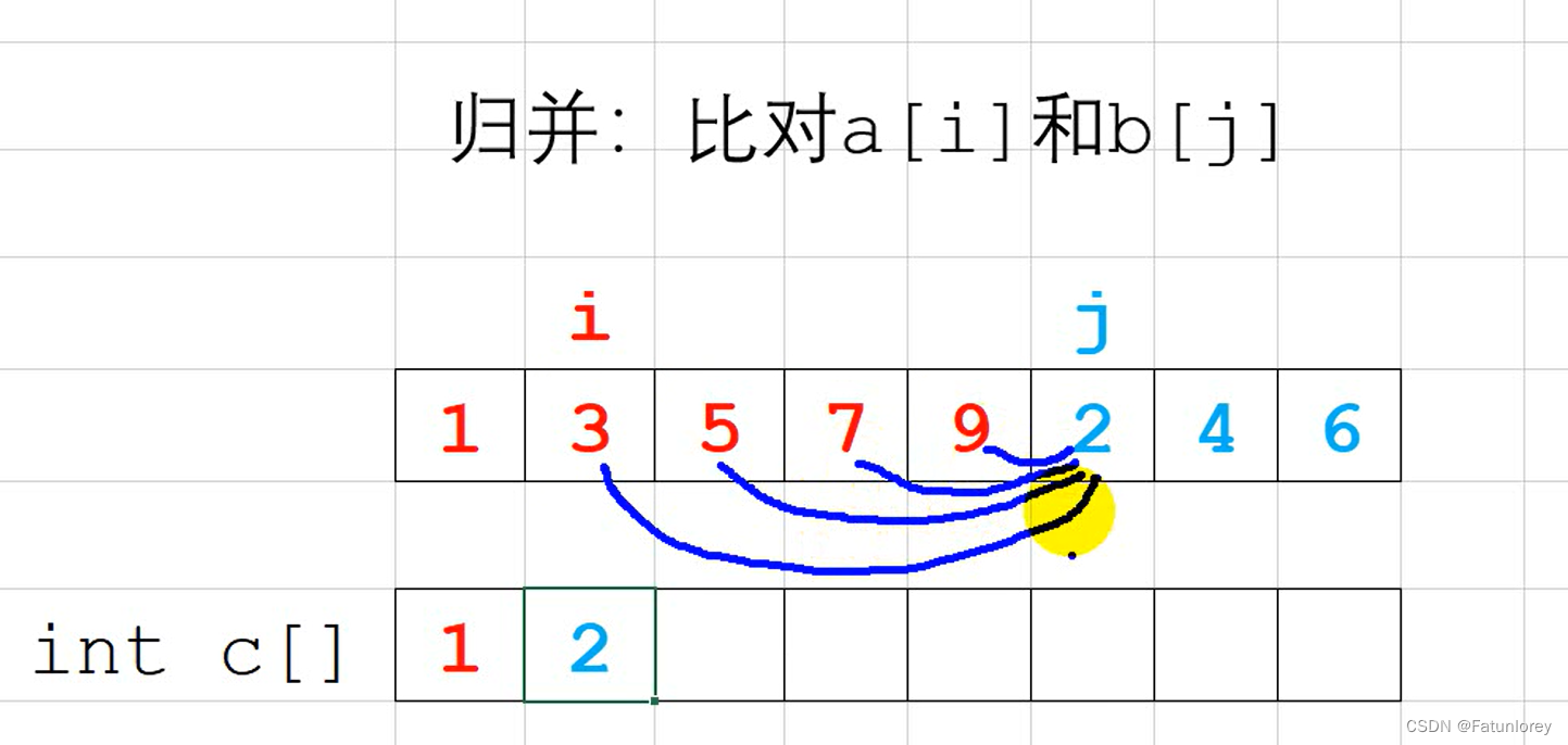 此时a[j]<a[i],由于两边都有序,发现3>2时,那么3之后的数也都大于2,就节省了比较的时间,