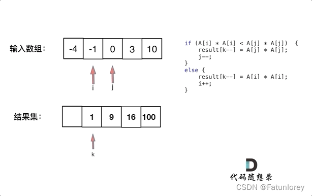 数组有关题目 大体思路是通过定义一个大小相同的数组,不断比较两端数平方的大小以确定填入新数组的数,因为两头都是大数,所以需要新数组从最后开始填入数据。示例 1: 输入:nums = [-4,-1,0,3,10] 输出:[0,1,9,16,100] 解释:平方后,数组变为 [16,1,0,9,100],排序后,数组变为 [0,1,9,16,100]示例 2: 输入:nums = [-7,-3,2,3,11] 输出:[4,9,9,49,121]977.有序数组的平方。