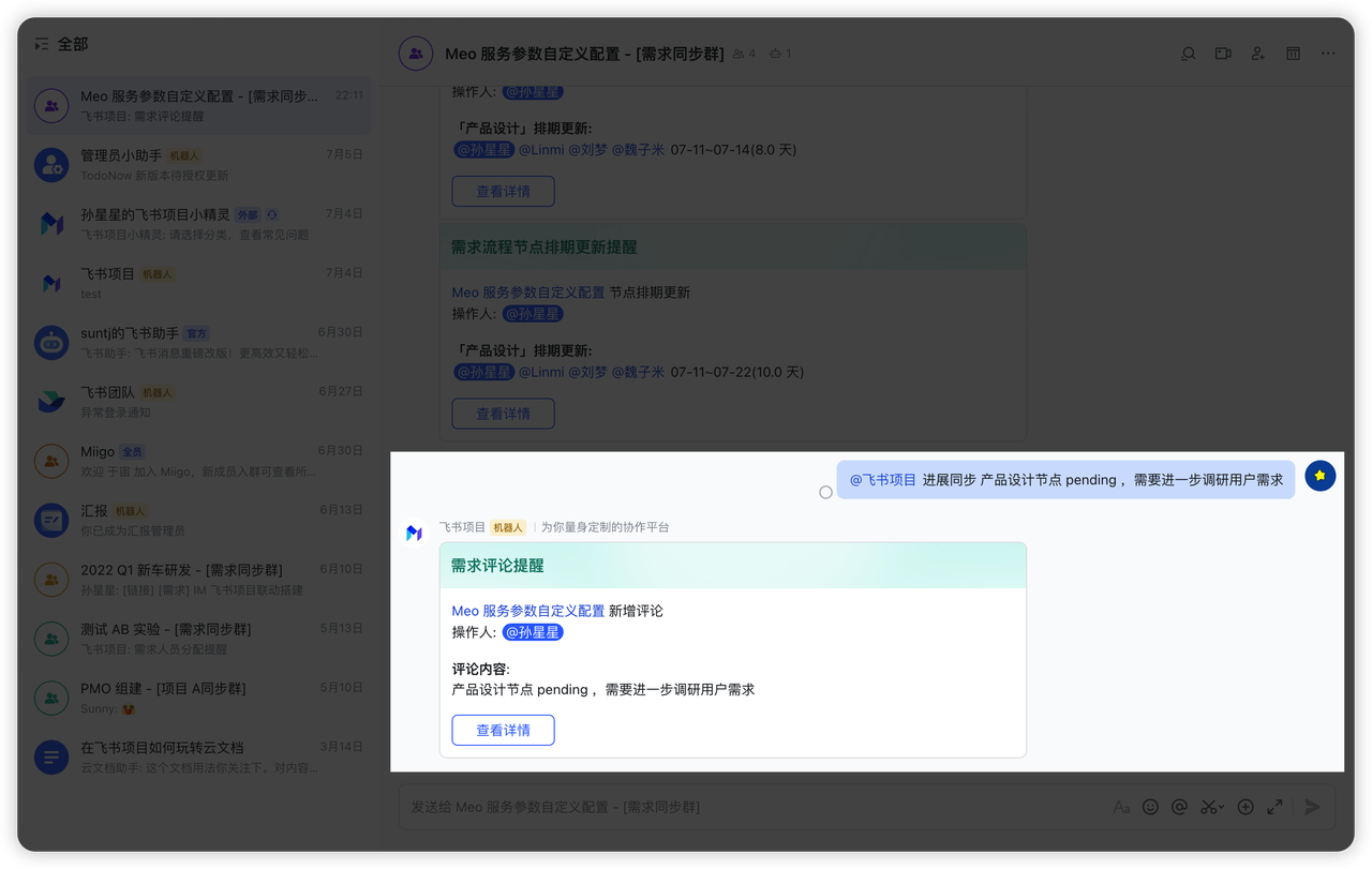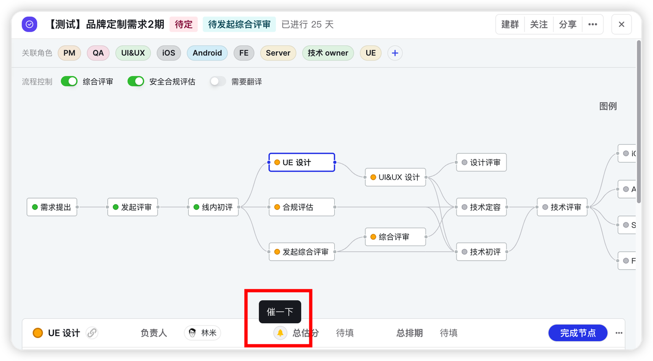 同时,需求状态的停留时长会直接显示在视图中,发现 block 点直接使用“催一催”功能,机器人直接推送提醒完成节点。