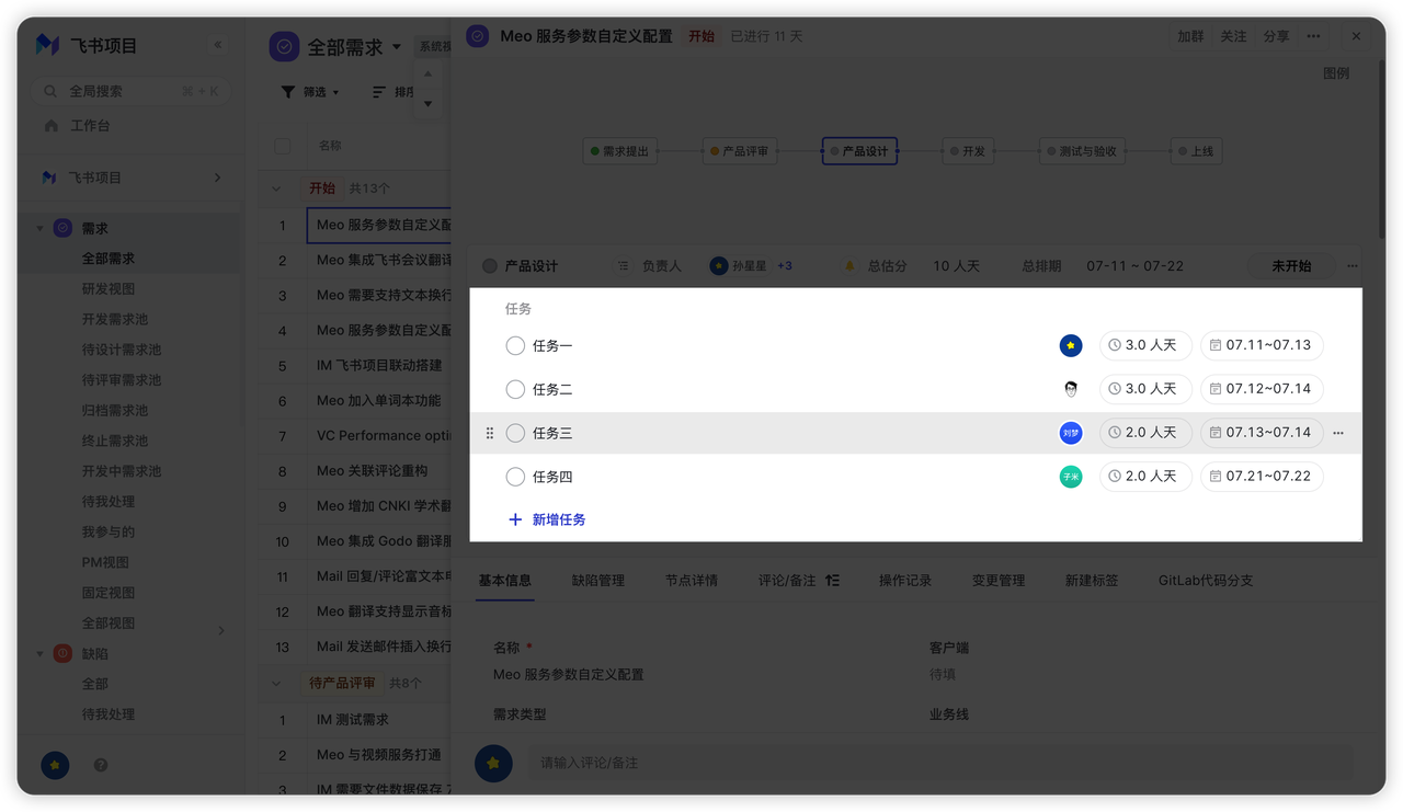 同时,飞书项目有丰富的第三方集成经验,提供全面的 OpenAPI 接口和 WebHook 能力,在内外部都有很多成功的实践。例如,通过平台提供的 GitLab 插件,关联 GitLab 中的代码分支和「飞书项目」中的项目需求。关联后,即可在「飞书项目」中查看需求所关联的代码分支及其状态。同时也可以通过 GitLab 侧 merge request 而推动需求的节点流转。