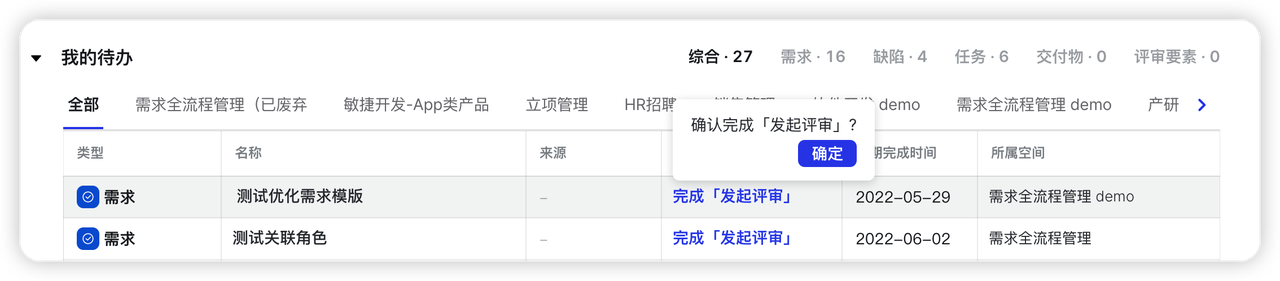 我不再需要到处询问需求进展,直接在工作台上看到我的待办和我参与的需求,也可以一键完成我的任务。