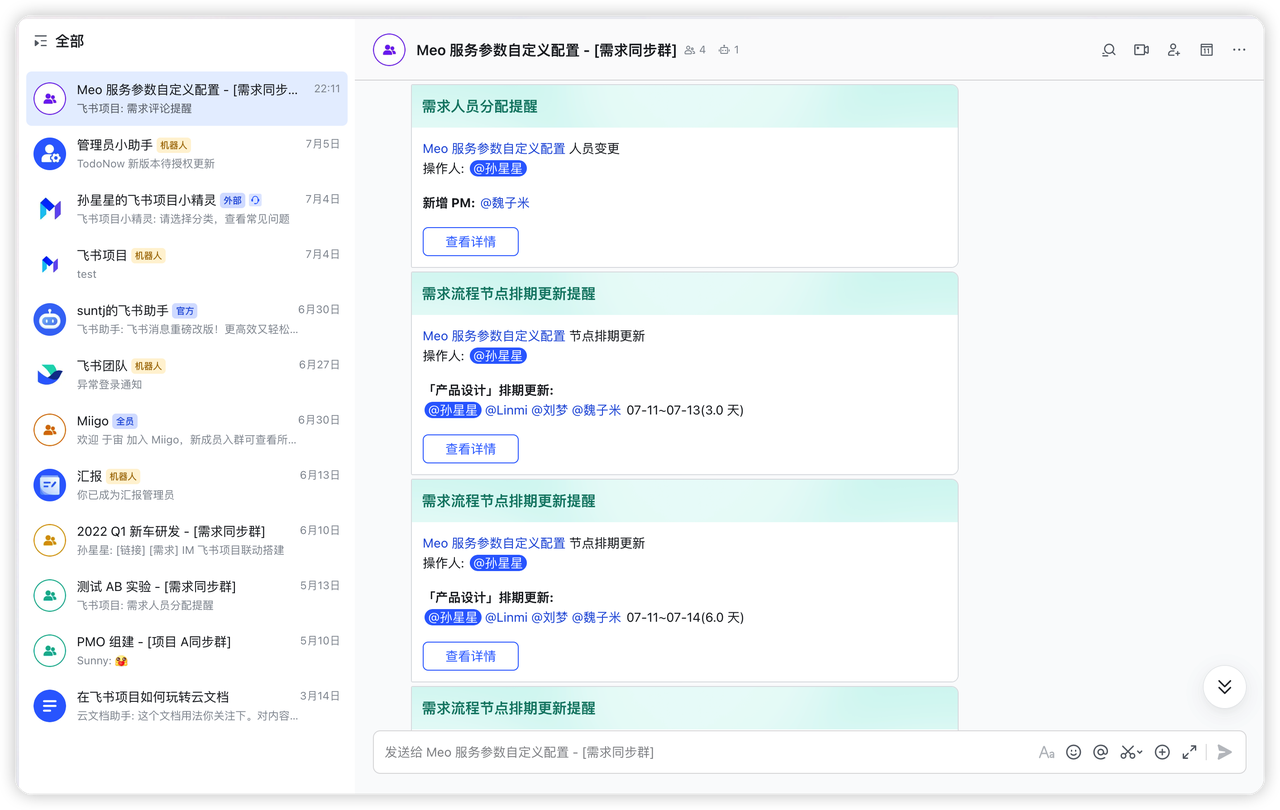 国内外经济学家都在致力于研究如何消除信息不对称的影响,经济学家认为信息不对称问题固然可以让市场参与者去解决,但更多的是要依赖分工和市场。同样,在生活和工作中,我们也在追求信息的对称以谋求平衡的发展。在组织协作中,每个人接收到的信息参差不齐,再加上团队人员的流动,对信息的感知更是相差甚远。上下游的协作者如果对于上下文不够了解,那么信息的不对称必然导致整个项目困难重重。所以,飞书项目支持一键拉起需求群,将相关角色的人员自动拉到群里,需求的全部进展和上下文都会展现在群聊中,即使在执行过程中有新成员的加入,也可以通过爬楼抓取到“原汁原味”的有效信息,而非口口相传的二手消息。