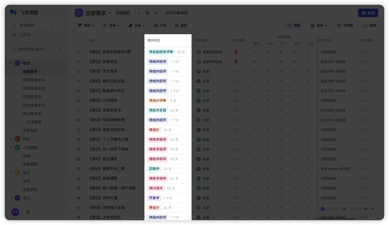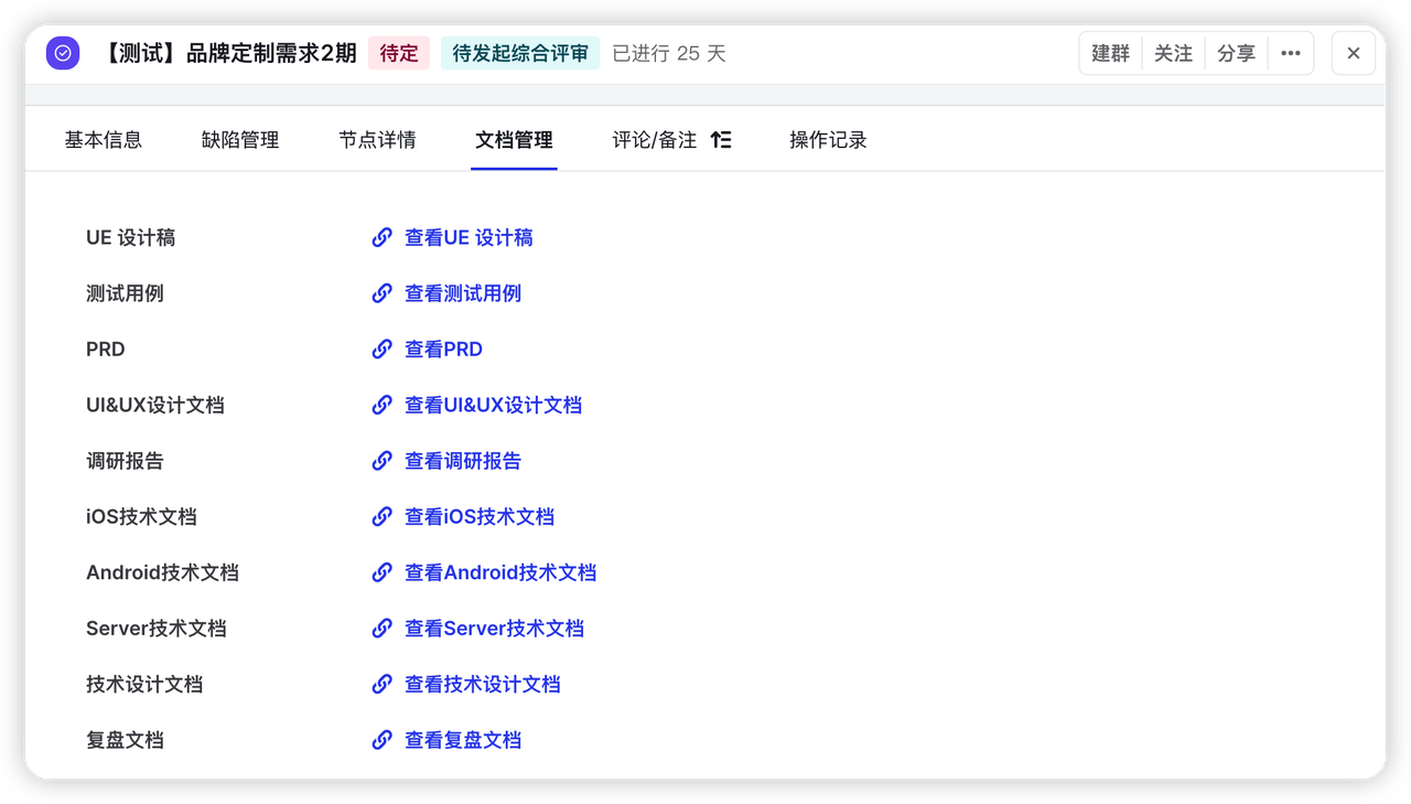 我们的 app 是两周一个版本,每个版本下会拆解很多个跟版需求,产品评审后的需求进入技术评审节点时群内会有自动通知,我们可以清晰地看到并行的二十多个需求的状态、优先级等信息。