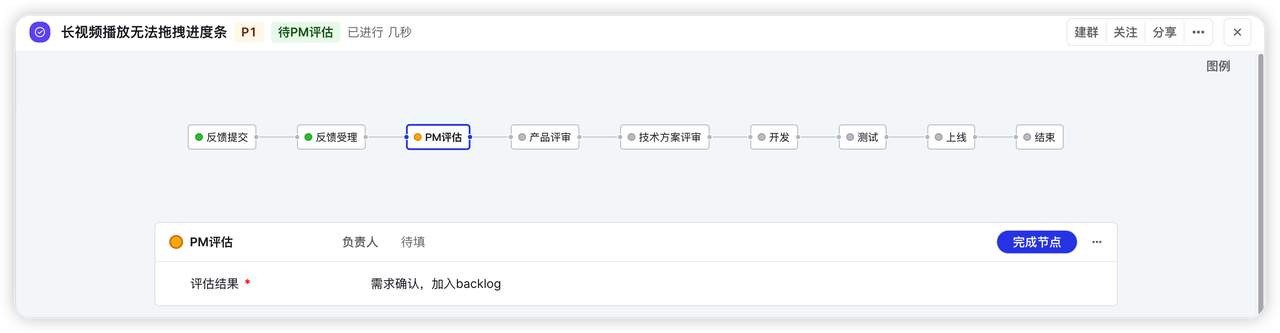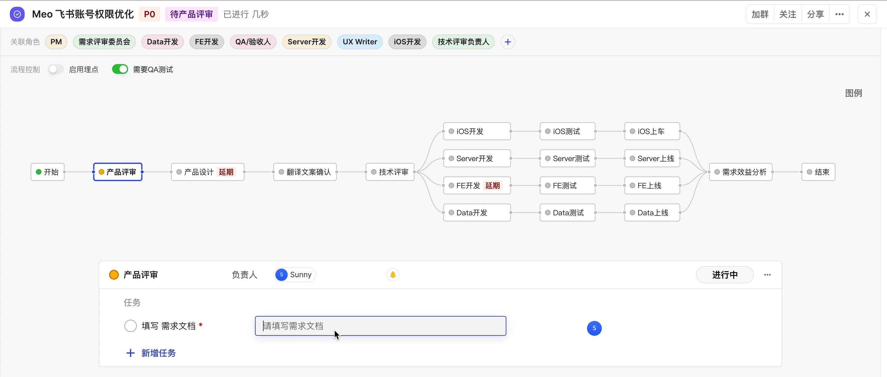 初期为了避免团队协作的不顺畅,便把每个流程节点安排得事无巨细明明白白,期望团队所有人员可以清晰自己的任务,但在实践中我们逐渐发现,当冗余的流程被摆在台面上,就需要人工操作不断的点击完成系统上的每个节点,仿佛给工具配了个工具人。好的流程应该是融入到过程当中,激发人的创造性,而不是束缚了人的思考。飞书项目的愿景是希望流程可以驱动成员,通过任务的自动分发,去提醒每个角色需要完成什么任务和交付物,完成后可以自动流转节点,既遵循了对团队来讲最高效的流程,又让每个角色对流程没有感知。