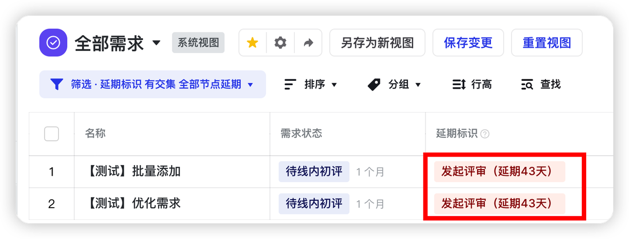 我也会通过视图来查看需求的进展情况,可以筛选出当前延期的需求,点进详情页可以了解需求的所有信息和延期节点的负责人,点进需求群即可看到延期的原因,如果有疑问也可以直接在群内沟通。