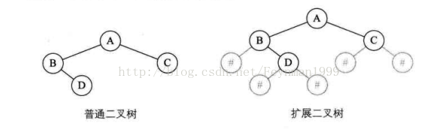 所以对于一颗普通二叉树,我们对其进行扩展。也就是将二叉树中每个结点的空指针引出一个“虚有的”结点,其值为特定,例如‘#’。一般称这种二叉树为原二叉树的扩展二叉树。对于扩展的二叉树,只要知道一种遍历的序列(前序或后序)即可确定一颗二叉树了。