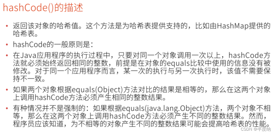 ·hashCode()是Object定义的方法,它将返回一个整型值,它并不代表对象在内存中的地址,它存在的价值是为Hash容器处理数据时提供支持,Hash容器可以根据hashCode定位需要使用的对象,也可以根据hashCode来排除2个不相同的对象,即:hashCode不同,则视为2个对象不同