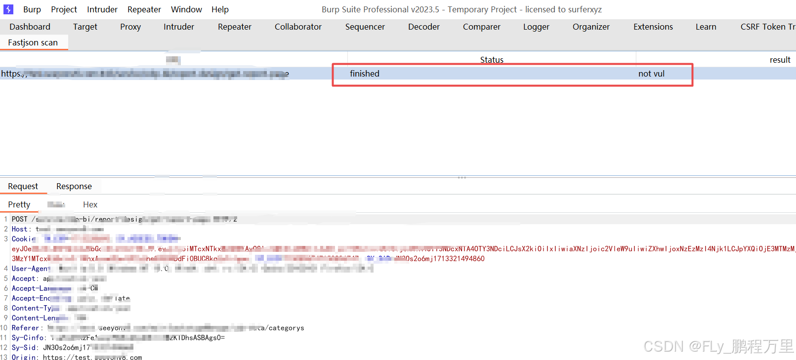 FastjsonScan是一个简单的Fastjson反序列化检测burp插件,项目地址:​​​​​​https://github.com/Maskhe/FastjsonScan使用方法也很简单,就像使用repeater一样,你可以在burp的任何地方选中一个请求右键选择【Send to FastjsonScan】将这个请求发送到Fastjson Scan,然后就只需要等待扫描结束FastjsonScan扫描结果界面:如果扫描的目标存在漏洞,在窗口下面的Request窗口会展示使用的payload,如果没有漏