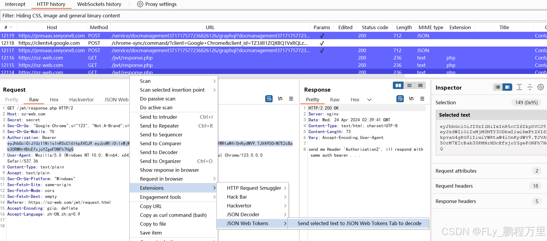 Json-Web-Token为Burpsuite进行JWT测试提供了便利,可以在代理历史中直接解码查看消息等,项目地址如下:GitHub - PortSwigger/json-web-tokens: JWT Support for Burp进入Burpsuite的External模块进行安装:访问项目主页的演示环境(https://oz-web.com/jwt/)后访问页面并使用Burp抓包发送关联报文到JWT中解密操作:本篇文章我们主要介绍了JWT插件的安装以及简易的使用方法,至于更详细更高级的使用请移步
