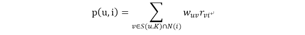 其中,S(u,K)包含和用户u兴趣最接近的K个用户,N(i)是对物品i有过行为的用户集合,w是用户u和用户v的兴趣相似度,r是用户v对物品i的兴趣,这里令所有的r=1.
