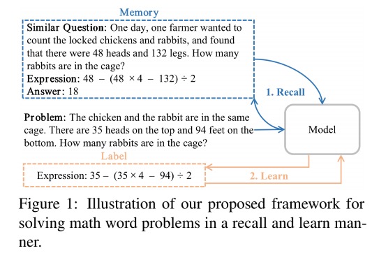 REAL4MWP-基于记忆增强的应用题自动解题方法 本篇文章主要讲解本人在今年EMNLP2021发表的一篇关于应用题自动解题的论文。论文题目为:Recall and Learn: A Memory-augmented Solver for Math Word Problems代码已开源,欢迎star:REAL4MWP另外,本人还搜集了近五年来所有关于应用题解题的论文,供研究该方向的学者参考:Math-Word-Problems-PaperList1. 背景介绍 数学应用题自动解题任务是指通过给定的应用题题目,设定特定的技术方案得到对应的答案。直接