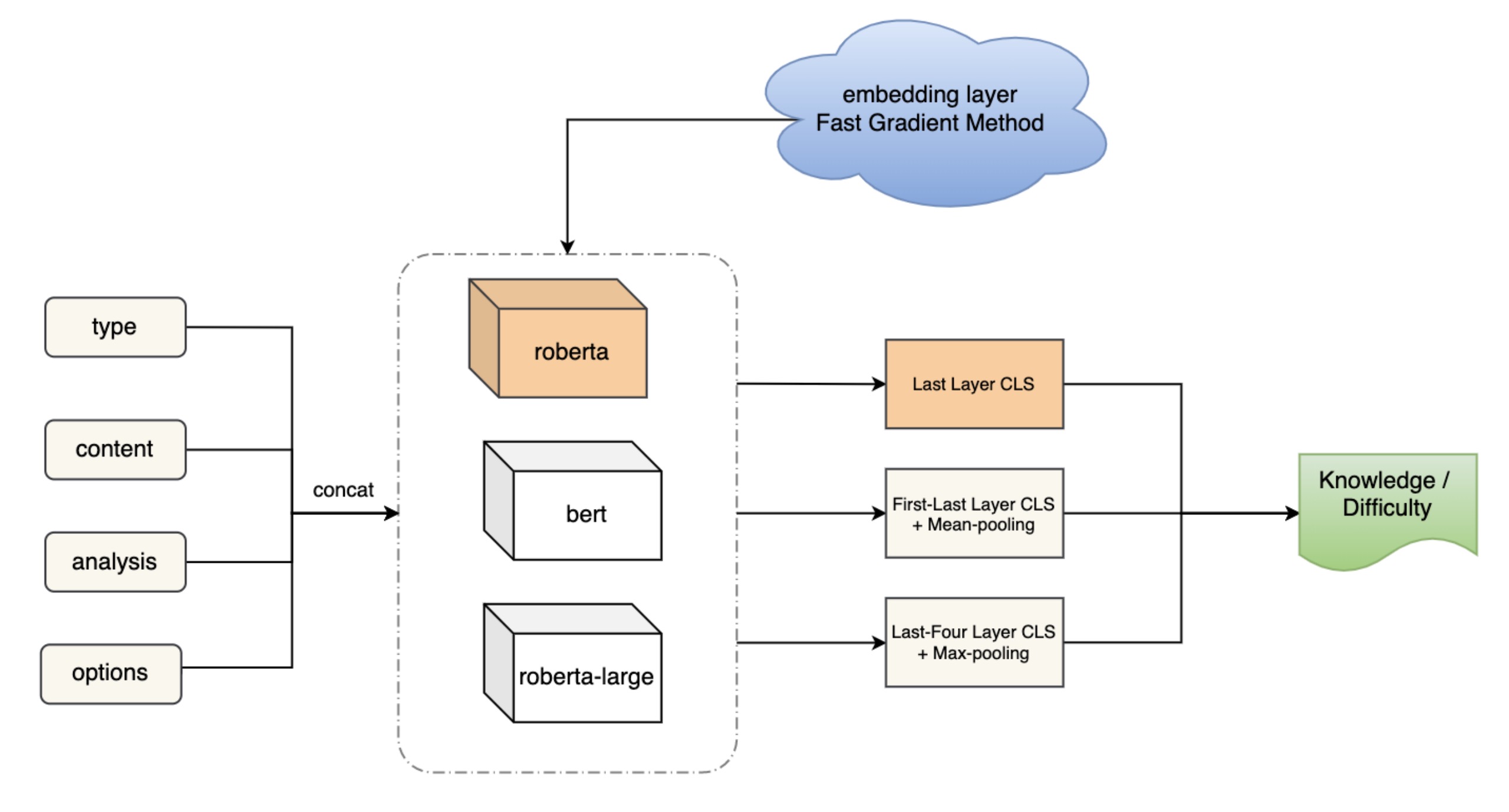 2021科大讯飞试题标签预测挑战赛亚军方案总结 1. 摘要 这个比赛的任务是根据题目的文本内容,预测题目的知识点及难度标签,其中知识点包括五个类型,我们需要预测出对应类型的知识点标签。 在本次比赛中,我们构造了六个独立的模型,模型结构相似,每个模型负责预测不同的目标。我们将题目类型,内容,分析,选项等信息进行拼接后作为输入,模型部分我们使用roberta[3]作为baseline模型,同时使用对抗训练的方法提高模型的鲁棒性。为了解决数据存在不平衡及多个类别样本量太少的问题,我们使用了EDA, AEDA等多种数据增强方法。同时,我们通过知识点近邻匹