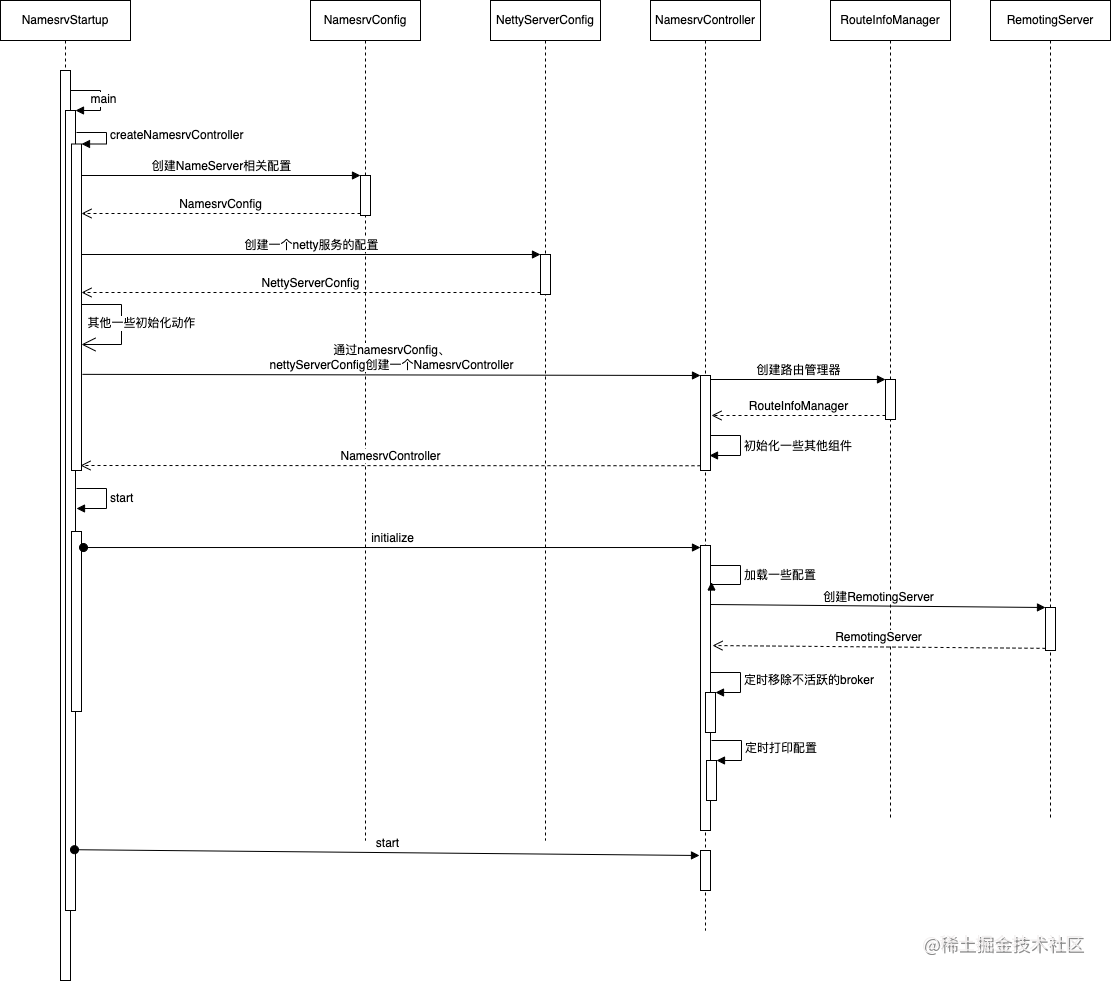 【转载】RocketMQ是怎么跑起来的? 原文链接:https://juejin.cn/post/7091096519947862023作者:pinnuliRocketMQ是怎么跑起来的?一说到RocketMQ,很多人人都知道其有四大组件,NameServer、Broker、Producer、Consumer,也大概都知道这四个组件分别有什么作用,负责什么功能,但是不知道这四个组件是如何配合的。今天我们就来聊聊,这四个组件如何配合,通过哪些核心的API或者组件进行通讯配合,让RocketMQ跑起来,完成一条消息的产生和消费。这里只会.