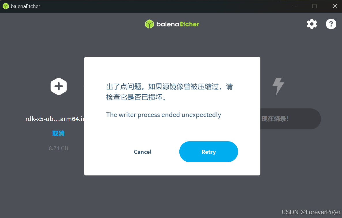 Etcher出了点问题。如果源镜像曾被压缩过,请检查它是否已损坏The writer process ended unexpectedly 问题:烧录RDK X5的镜像时出现下图问题。解决:更换其他镜像制作工具,比如rufus,烧录成功。