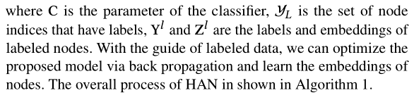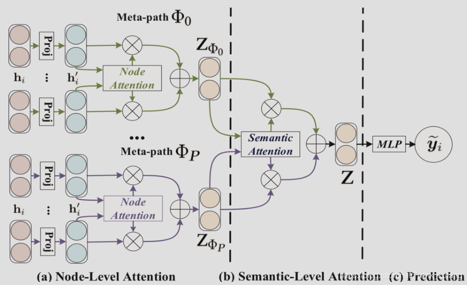 图2:总体框架(a)所有类型的节点都投影到一个统一的特征空间中,并且可以通过节点级别的注意力来学习基于元路径的节点对的权重。 (b)联合学习每个元路径的权重,并通过语义级别的注意力来融合特定于语义的节点嵌入。(c)计算所提到的HAN的loss和端到端优化。