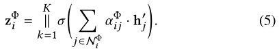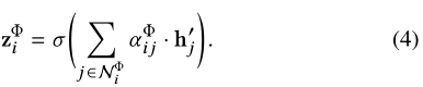 然后,节点i的基于元路径的嵌入可以通过邻居的投影特征与相应的系数进行汇总,如下所示: