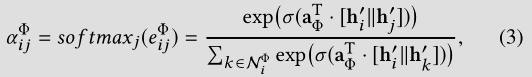 是元路径Φ的节点级注意力向量。通过softmax计算出节点j的权重系数,这里得到的系数也是非对称的,这就是注意力系数了。