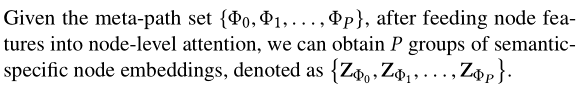 为了学习到更综合的信息,我们需要根据meta-path将多种语义信息融合到一起。将Node-level Attention的结果作为输入,来学习每条语义的权重。
