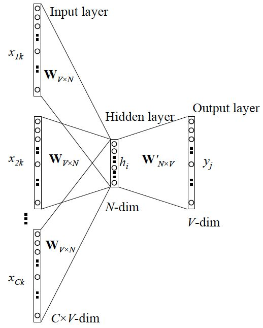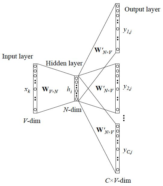 CBOW和skip-gram恰好相反,它是基于某中心词在文本序列前后的背景词来生成该中心词,网络结构为:
