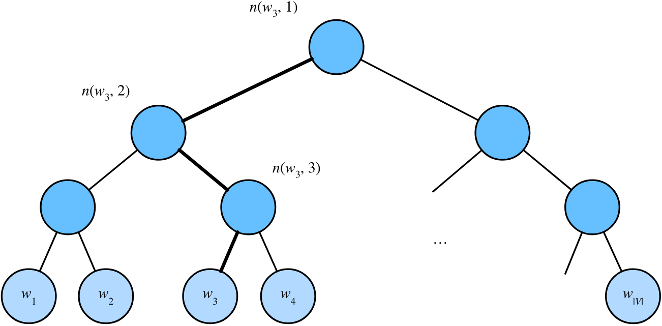hierarchical softmax是另一种近似训练法。它使用了二叉树这一数据结构,树的每个叶结点代表词典 V \mathcal{V} V 中的每个词。