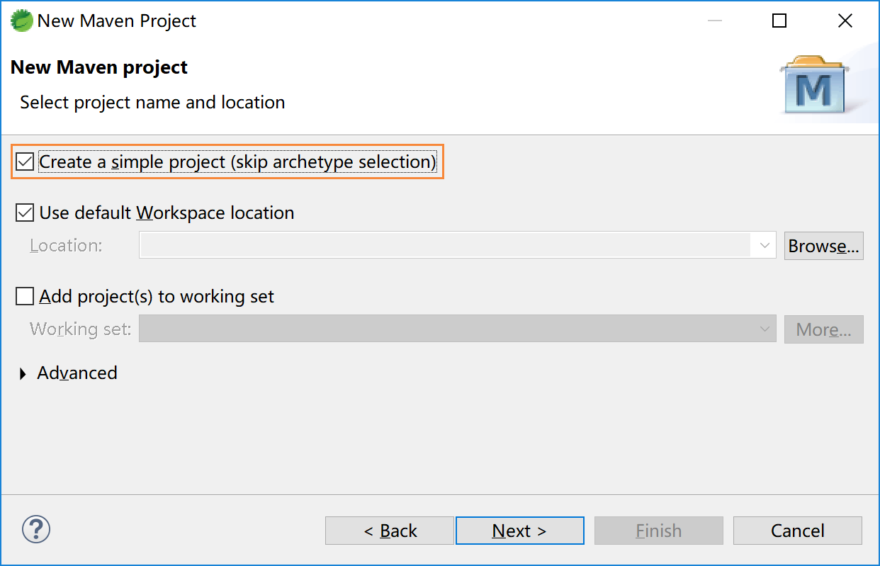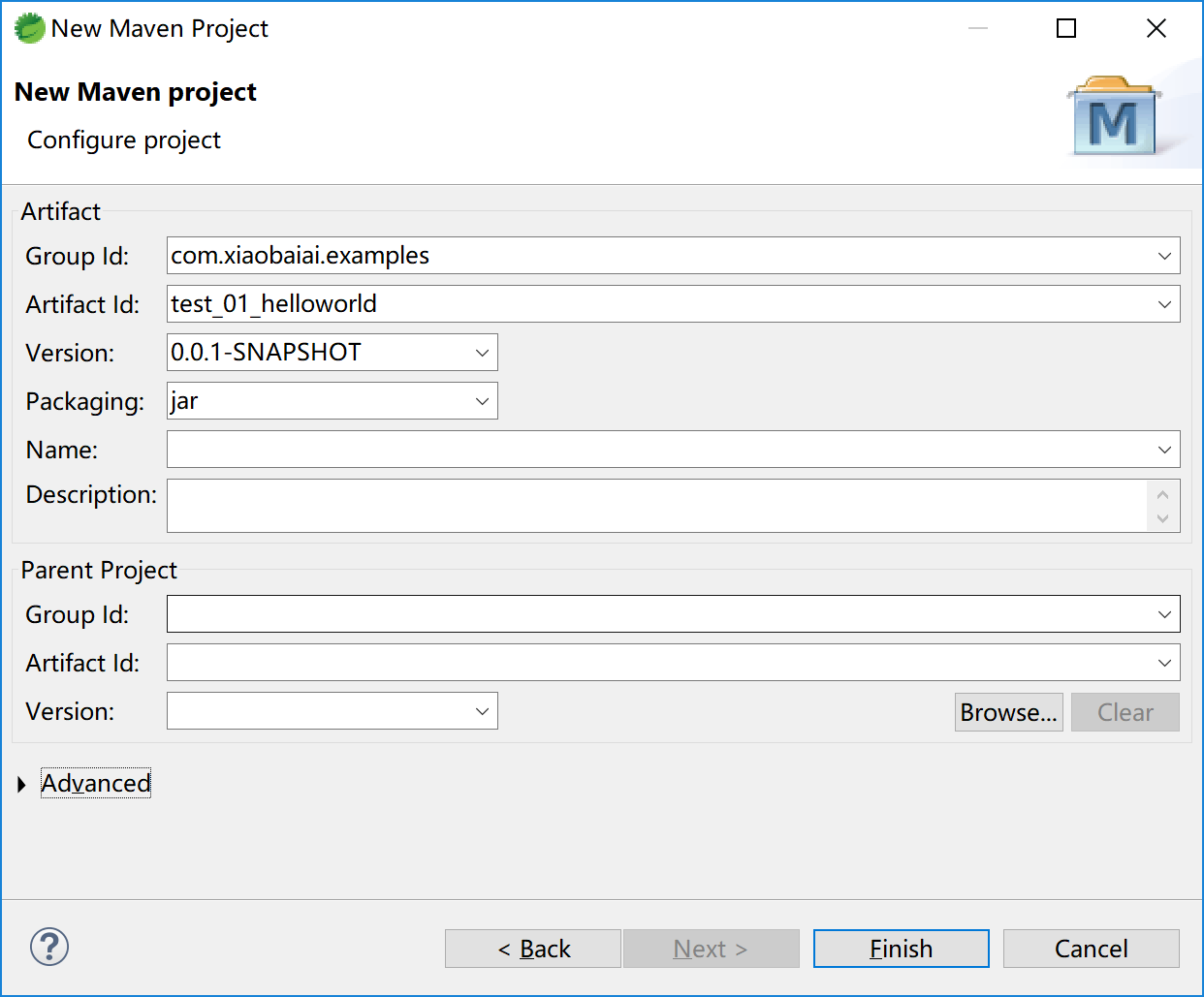 创建Marven项目中,我们选择Create a Simple Project,可以选择默认工作目录或者其他存放项目的目录,Next后需要我们填写一些项目信息,包括: