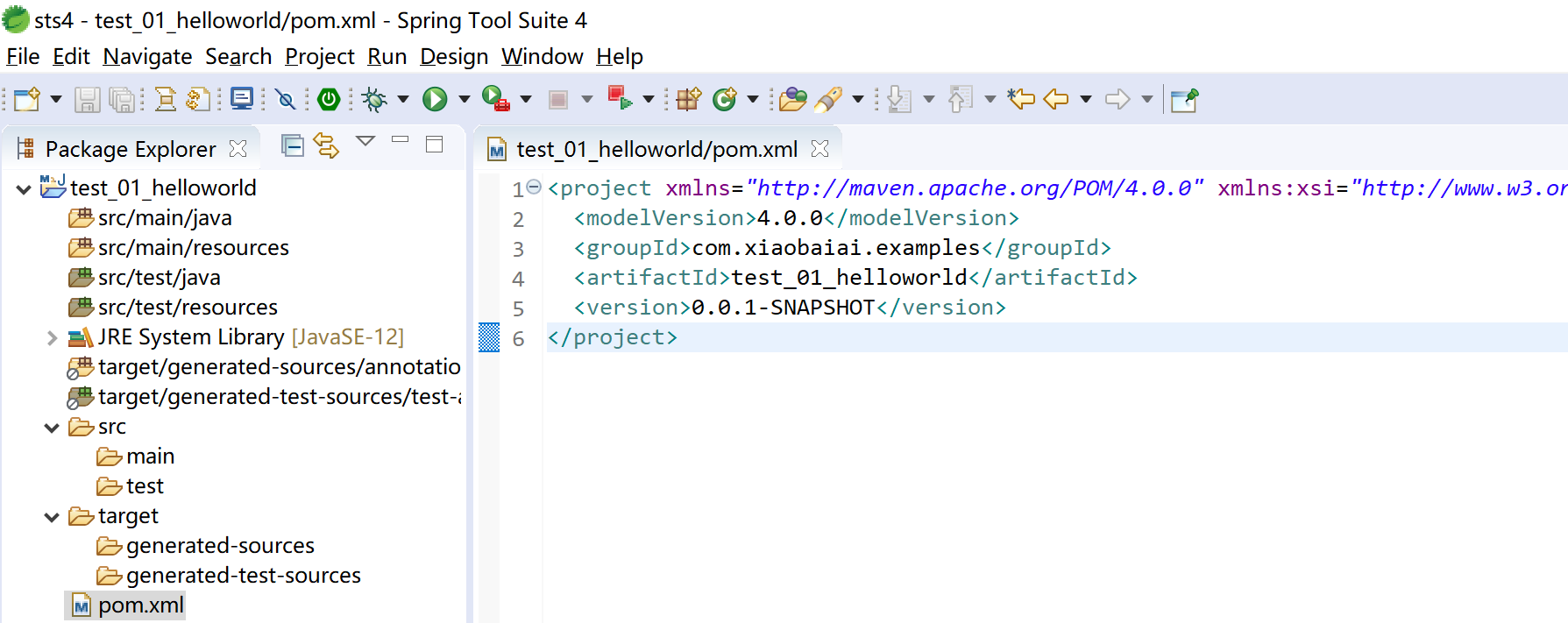 导入成功后,可以看到自动生成了上一小节中我们创建的pom.xml和XXApplication.java文件以及测试文件XXApplicationTests.java,其中pom.xml具体内容如下: