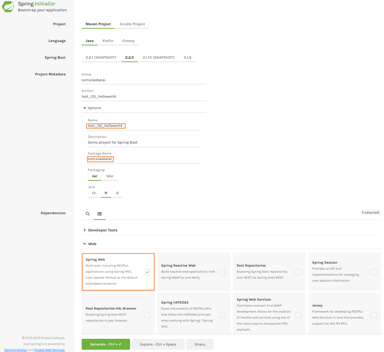 在浏览器中打开https://start.spring.io,输入项目相关信息,并选择Spring Boot及构建工具等,在Dependencies的Web栏中选中Spring Web,最后点击绿色按钮Generate - Ctrl按钮生成工程文件压缩包,放于你的工作目录中并解压,然后用STS导入该项目: