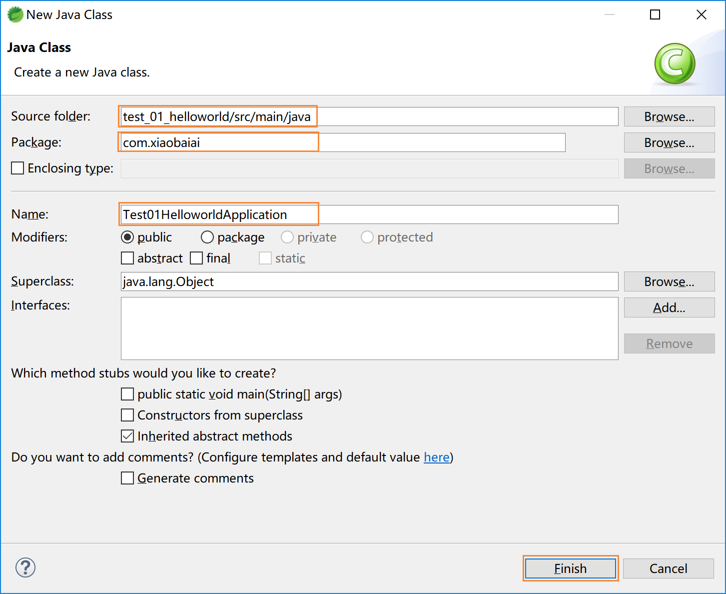 填写Package和Name,点击Finish,创建完成,然后编写该Java文件:
