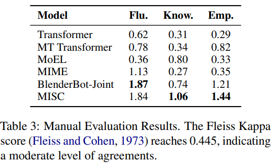 - 人工评价显示 MISC 模型的回复包含更多的背景知识。