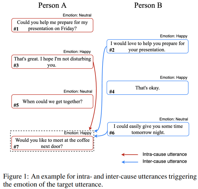 - 对话双方的话语中,存在可以帮助推理对方情感的交互因果联系 (Inter-cause)
