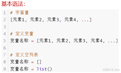 Python 第五章 数据容器 列表的每一个数据,称之为元素以[]作为标识列表中每一个元素之间,用逗号隔开注意:列表可以一次存储多个数据,且可以为不同的数据类型,支持嵌套总结:1.列表的定义语法元素1,元素2,元素3, ......]2.什么是元素?数据容器内的每一份数据,都称之为元素3. 元素的类型有限制吗?元素的数据类型没有任何限制,甚至元素也可以是列表,这样就定义了嵌套列表思考:列表是可以修改的。如果想要传递的信息,不被篡改,列表就不合适了。