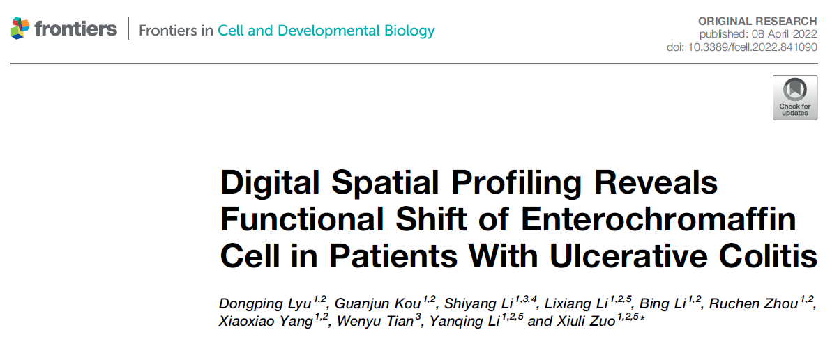 非因解读 | 学术爆款“DSP空间转录组技术”,克服传统方法限制快速发文 溃疡性结肠炎(UC)是炎症性肠病的主要形式。目前,UC的发病率全球范围内正在不断增加。虽然许多因素已被报道与UC相关,但对UC的病理认识仍然不足。肠嗜铬细胞(enterochromaffin, EC)作为肠内分泌系统的主要组成部分,在溃疡性结肠炎中起着关键作用,然而EC细胞的稀缺和分散分布严重限制了现有方法对其功能的研究。为了深入研究EC细胞在UC中的确切作用,2022年4月山东大学高等医学研究院李石洋课题组联合山东大学齐鲁医院消化内科实验室,在《Frontiers in Cell and Developm