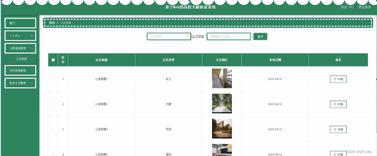 公告信息管理,学生通过公告信息管理可以在线查看公告标题、公告类型、公告图片、发布日期等内容,如图5-3所示。