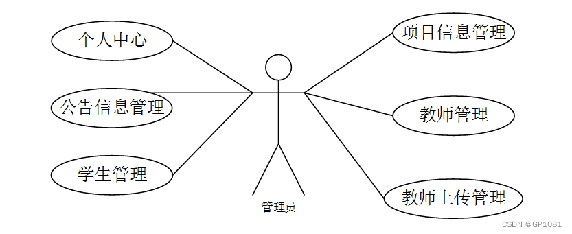 管理员主要实现的功能有:个人中心、学生管理、教师管理、公告信息管理、项目信息管理、教师上传管理,管理员用例图如图3-2所示。