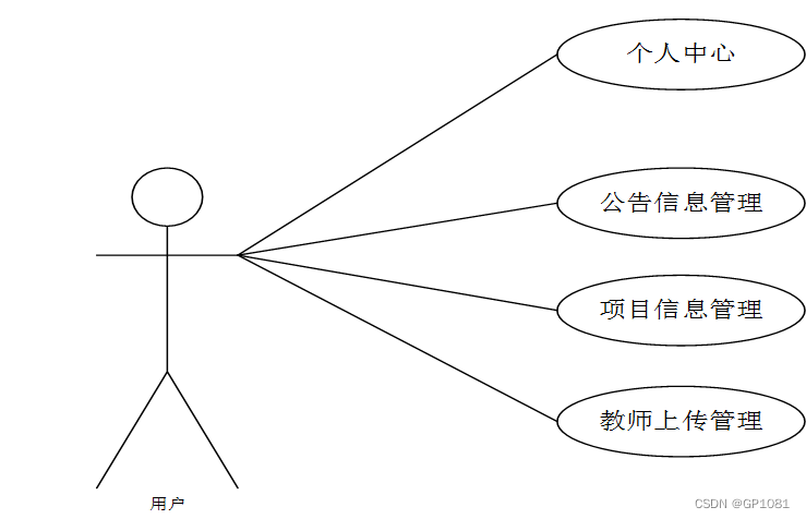 用户主要实现的功能有:个人中心、公告信息管理、项目信息管理、教师上传管理,用户用例图如图3-1所示。