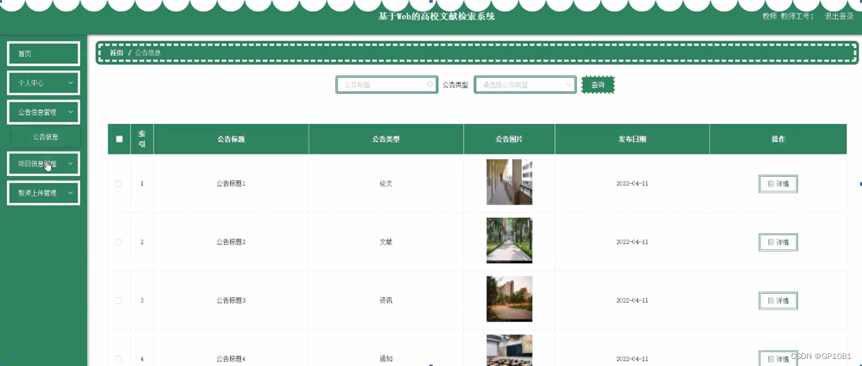 公告信息管理,教师可在公告信息管理页面查看公告标题、公告类型、公告图片、发布日期等内容,如图5-8所示。
