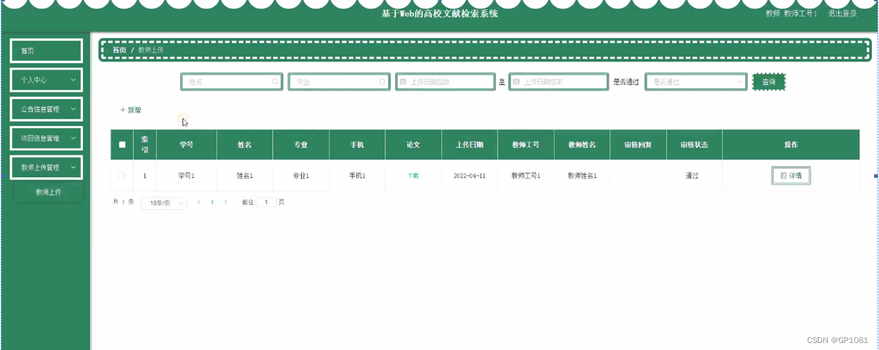 教师上传管理,教师可在教师上传管理页面查看学号、姓名、专业、手机、论文、上传日期、教师工号、教师姓名、审核回复、审核状态等内容,还可进行新增等操作,如图5-10所示。