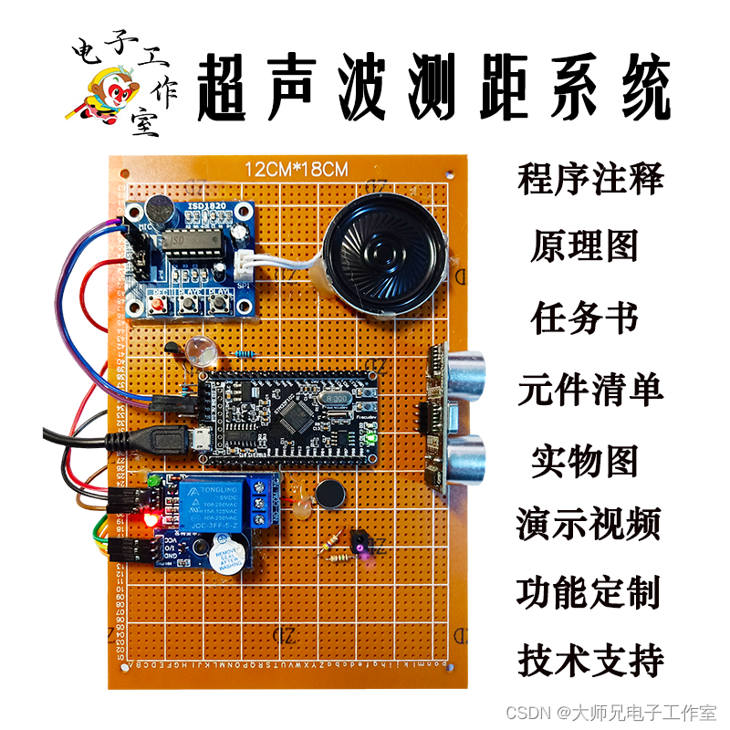 基于STM32单片机的语音播报超声波测距系统【ISD1820录放模块继电器蜂鸣器扬声器】 使用STM32开发板,先用红外测试是否有遮挡,如果有,则使用超声波测距。如果是0-80cm之间,则打开蜂鸣器、灯、喇叭播放"当心车门开启",震动马达震动(以上持续1分钟)