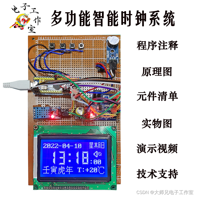 基于STM32单片机的多功能智能时钟【DHT11温湿度传感器蜂鸣器报警12864液晶显示】 系统可以显示日期、时间、星期、温度、湿度,可以对日期时间进行设置,可以设置闹钟,可以打开和关闭背光显示,有两种计时模式:正计时和倒计时。