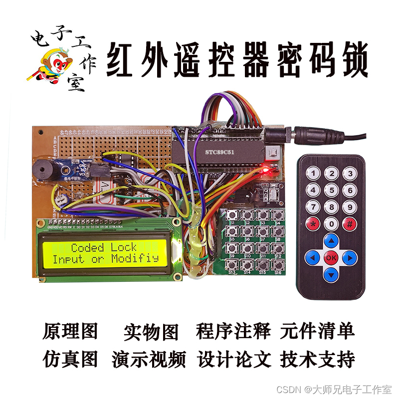 基于51单片机的红外遥控器密码锁【红外接收矩阵键盘液晶显示蜂鸣器报警】 利用红外遥控技术和单片机的相应技术实现,使用【红外遥控器】或【矩阵按键】控制密码锁的开锁、出错报警、超次锁定、修改用户密码等基本的密码锁的功能以及遥控、掉电存储、声光提示等功能。