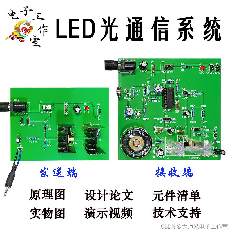 LED光通信音频传输系统(PCB)【达林顿三极管PIN光电二极管功率放大】 该设计是以模拟电路为核心设计而成的通信系统,实现了在发射端发射音频信号,并且能在接收端接收并播放音频信号。该设计电路包括两个部分,发射端电路和接收端电路,在发射端部分,用手机播放音乐,通过耳机线将音频信号传输到发射电路,在发射电路部分,用TIP122来驱动9V、4.5W的LED,使其工作在照明状态,音频信号经过放大后加载到LED上,完成发射端功能。