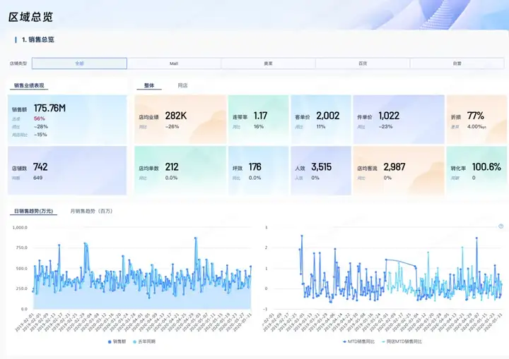 总部层面,战略决策缺乏精细化数据支撑,管理层仅能看到大盘销售额波动,却无法穿透至区域客群差异、单店商品动销等细节,导致促销策略“一刀切”,资源投放精准度不足。