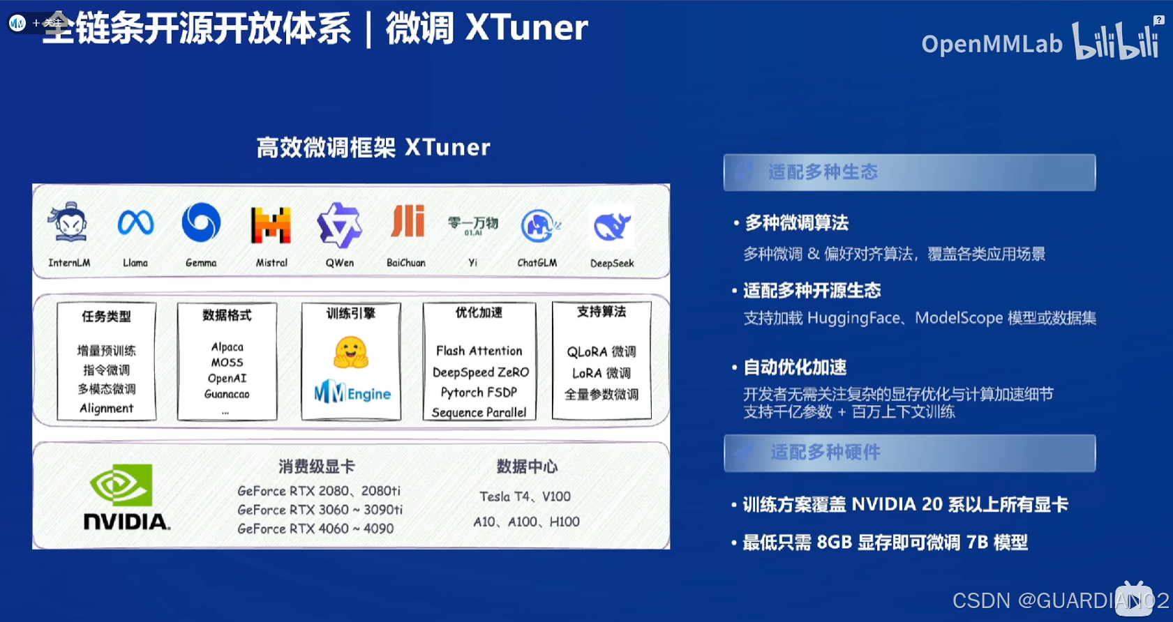 - 硬件适配性好:支持 NVIDIA 20 系以上所有显卡,最低只需 8GB 显存即可微调 7b 模型,还支持多种数据格式。