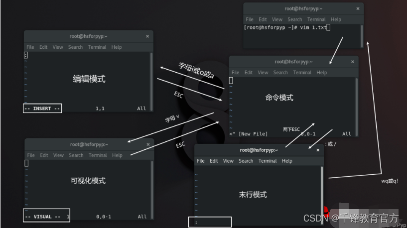 答:在 Linux 操作系统中,当我们使用 vim 命令直接打开某个文件时,默认进入的就是命令模式。如果我们处于其他模式(编辑模式、可视化模式以及末行模式)可以连续按两次 Esc 键也可以返回命令模式