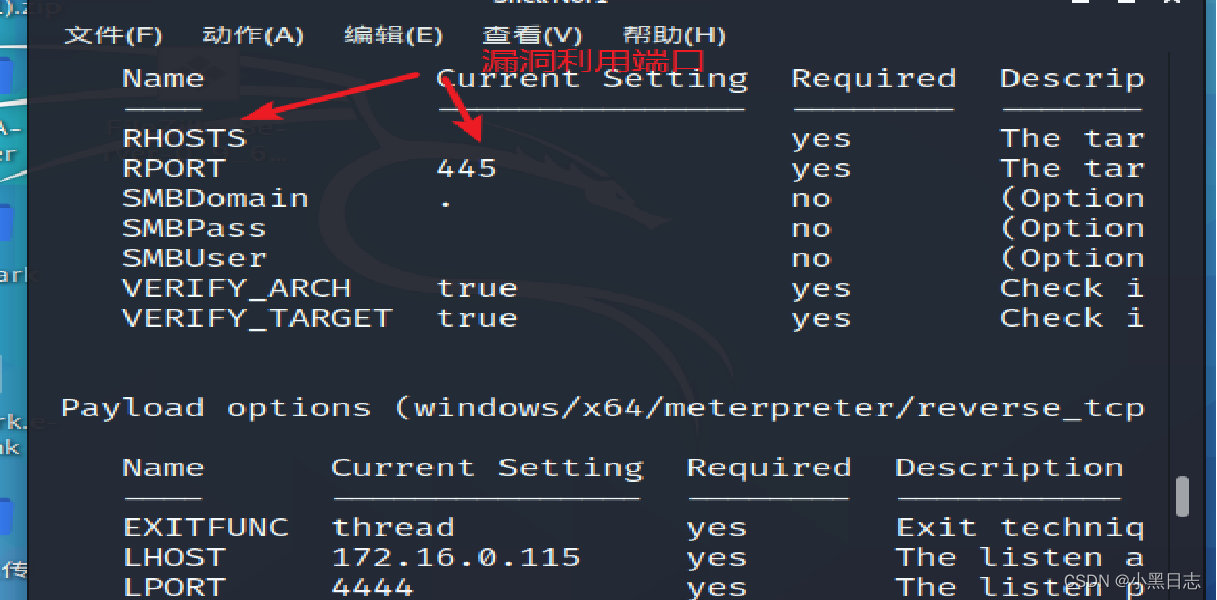 4、set RPORT 445 设置目标靶机的开放端口 445