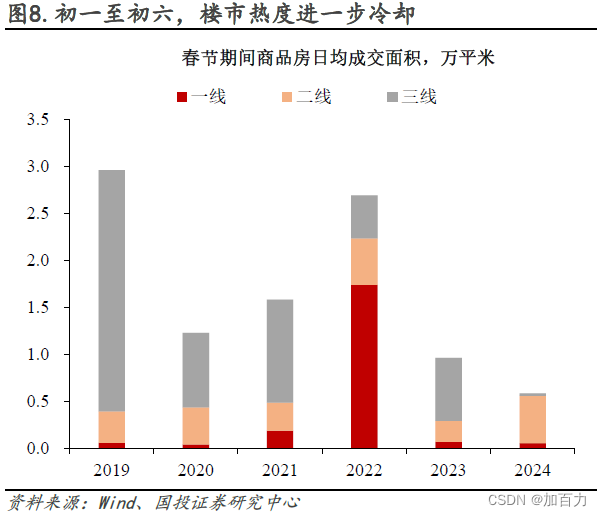 楼市偏冷的基调延续。今年春节假期楼市热度进一步冷却。从各线城市的销售面积来看,正月初一至初六,30城楼市商品房平均成交面积继续下滑至2019年以来新低,较去年下滑39.2%,其中一线、三线均呈现大幅下滑,而二线城市成交则出现反弹。目前可得的统计数据统计区间偏短,但楼市余温整体持续冷却的趋势较为明确。一般而言春节期间的成交大多集中在假期最后一天,而今年假期偏长,待初七及初八数据出炉以后,各能级城市之间的差异可能更为清晰。(国投证券)