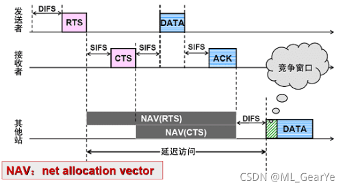 •为了避免冲突和“隐藏终端”,发送端可以请求预留信道而不是随机访问,通过RTS(Request to Send请求发送帧)和CTS(Clear to Send清除发送帧)实现。