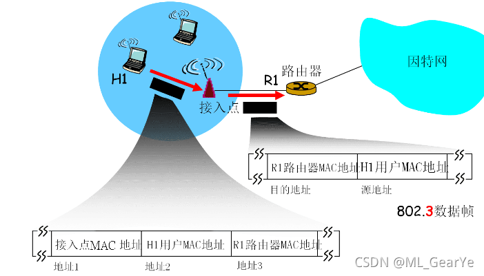 •三个地址域(地址1-3)在无线基本服务组和上层网络数据交换中起了至关重要的作用,用于802.11数据帧和以太网数据帧格式中地址域的转换。