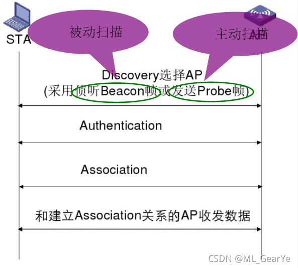 •关联:STA和一个AP建立关联后,后续的数据传输只能在两者之间进行。