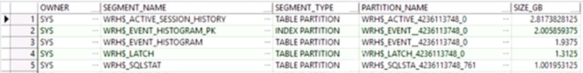 WRH$_*系列表)占用,即使已执行AWR清理,部分分区数据仍未释放。 -